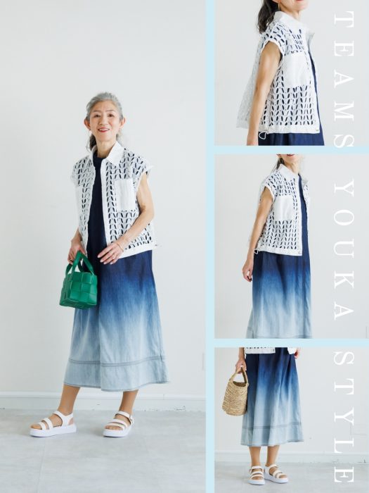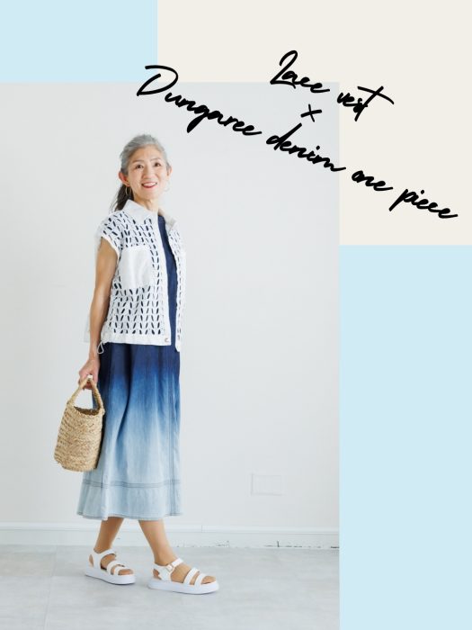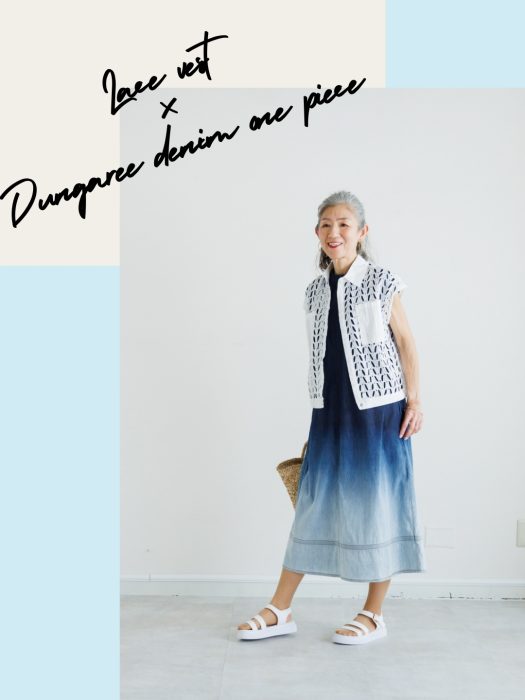 風に揺れるレースベストと、やわらかなダンガリーデニムのワンピース。