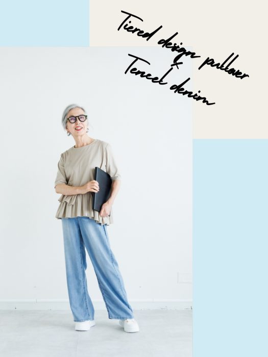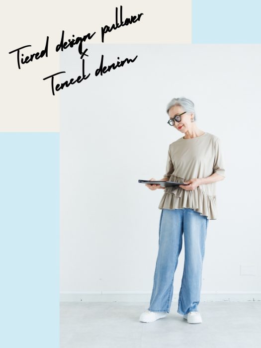 ふんわりとしたティアードトップスに、さらりと軽いテンセルデニムを合わせて、動きやすく心地よいのに、きちんと感も◎