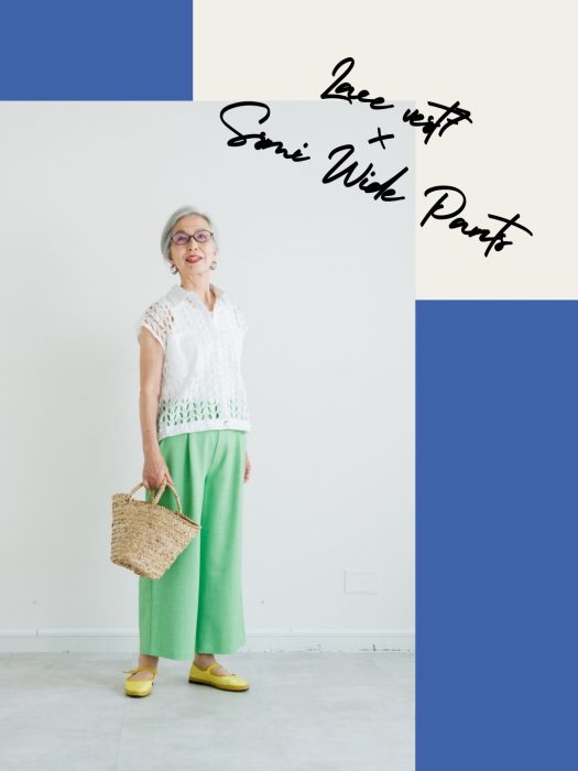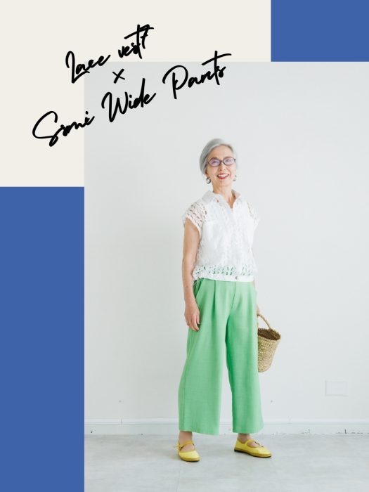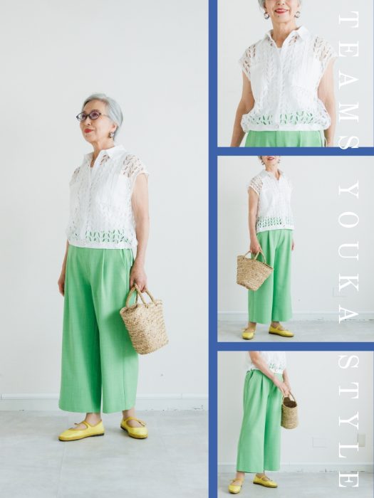 レースベスト(ホワイト) × セミワイドパンツ(グリーン)
