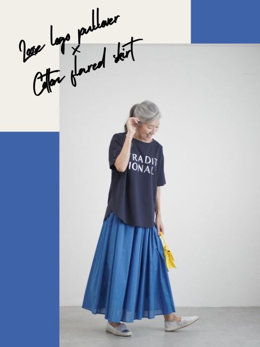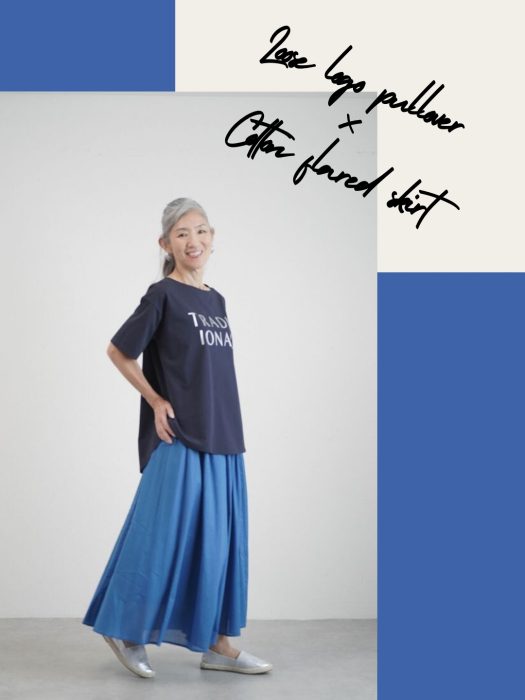 ルーズロゴプルオーバー(ネイビー)×コットンフレアスカート(ブルー)