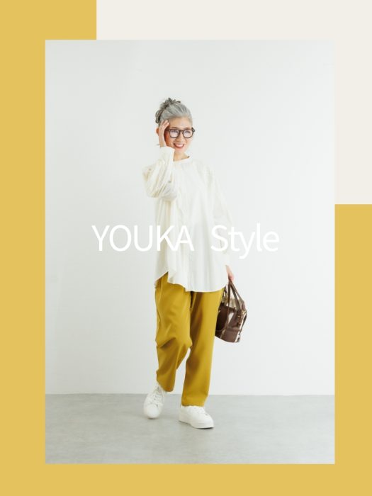 イエローのテーパードパンツを合わせれば、自然の緑に映える明るさをプラスしてくれます。