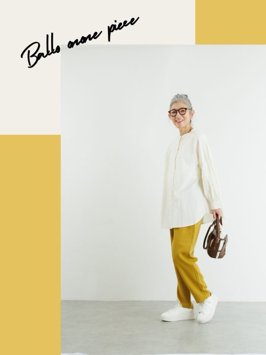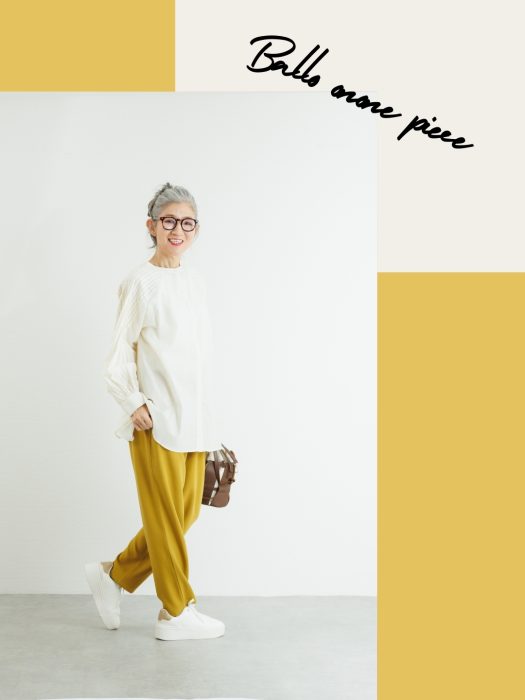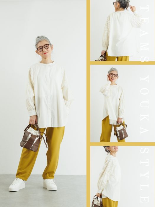 袖タックブラウス(ホワイト)×テーパードパンツ(イエロー)
