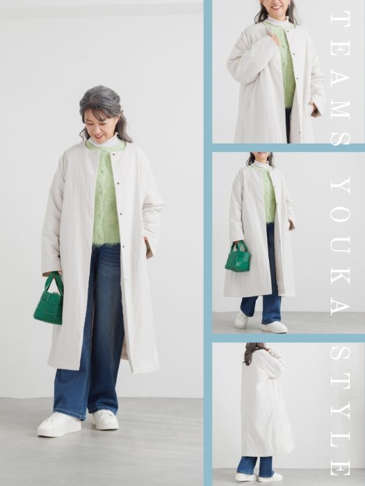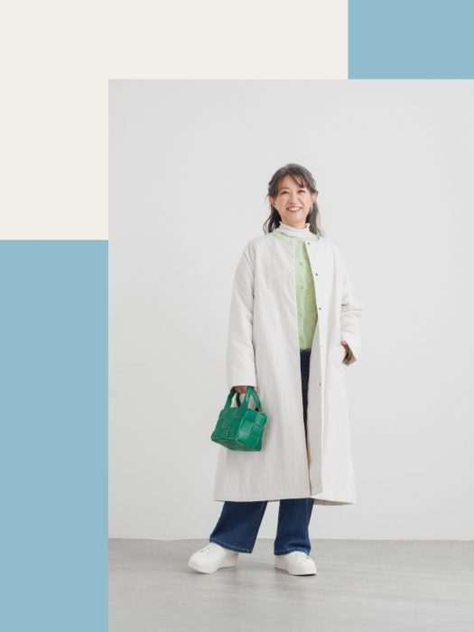 明るいカラーのアウターを選べば、寒さが厳しい季節でも気持ちを明るくしてくれます。インナーもイエローグリーンを合わせて、顔まわりをぐっと明るく仕上げました。