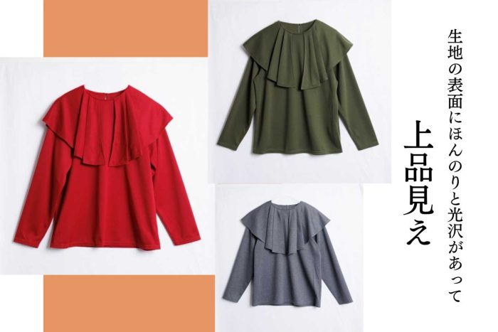 ストレッチ性があり、Tシャツのように扱いやすく、動きやすいのも魅力です。表面のさらりとした光沢が、装いを上品に見せてくれます