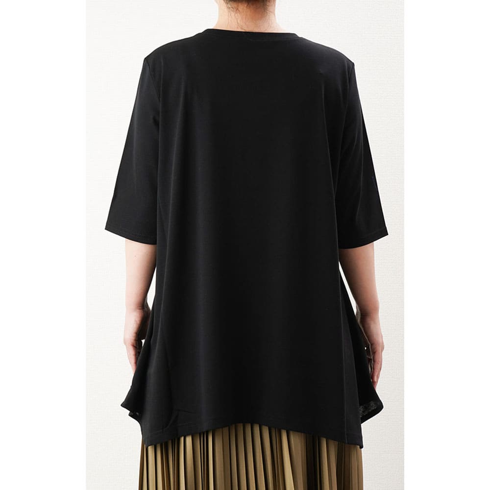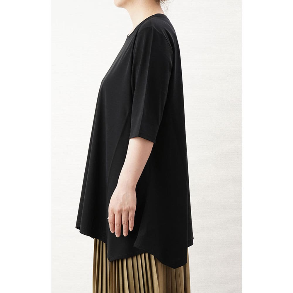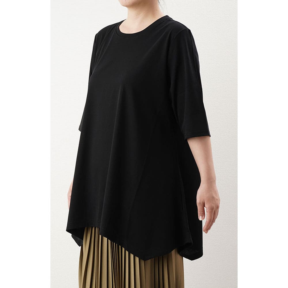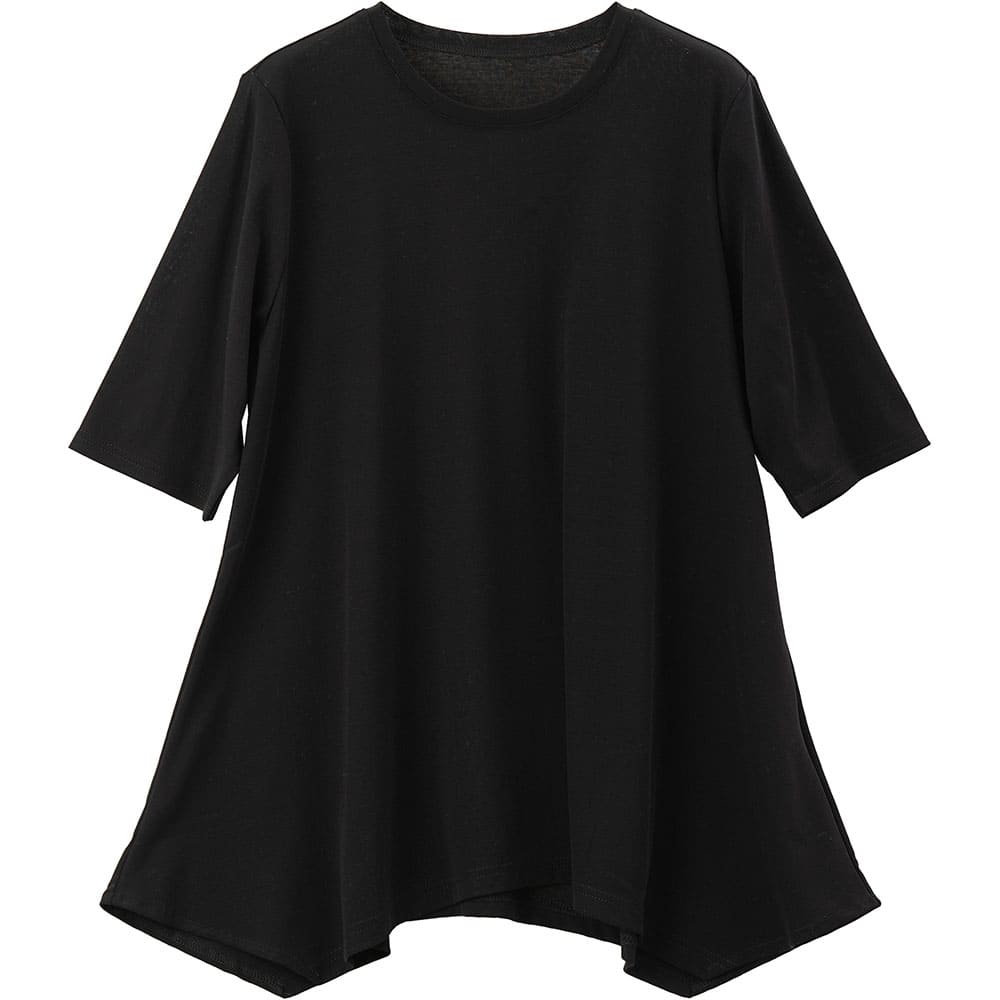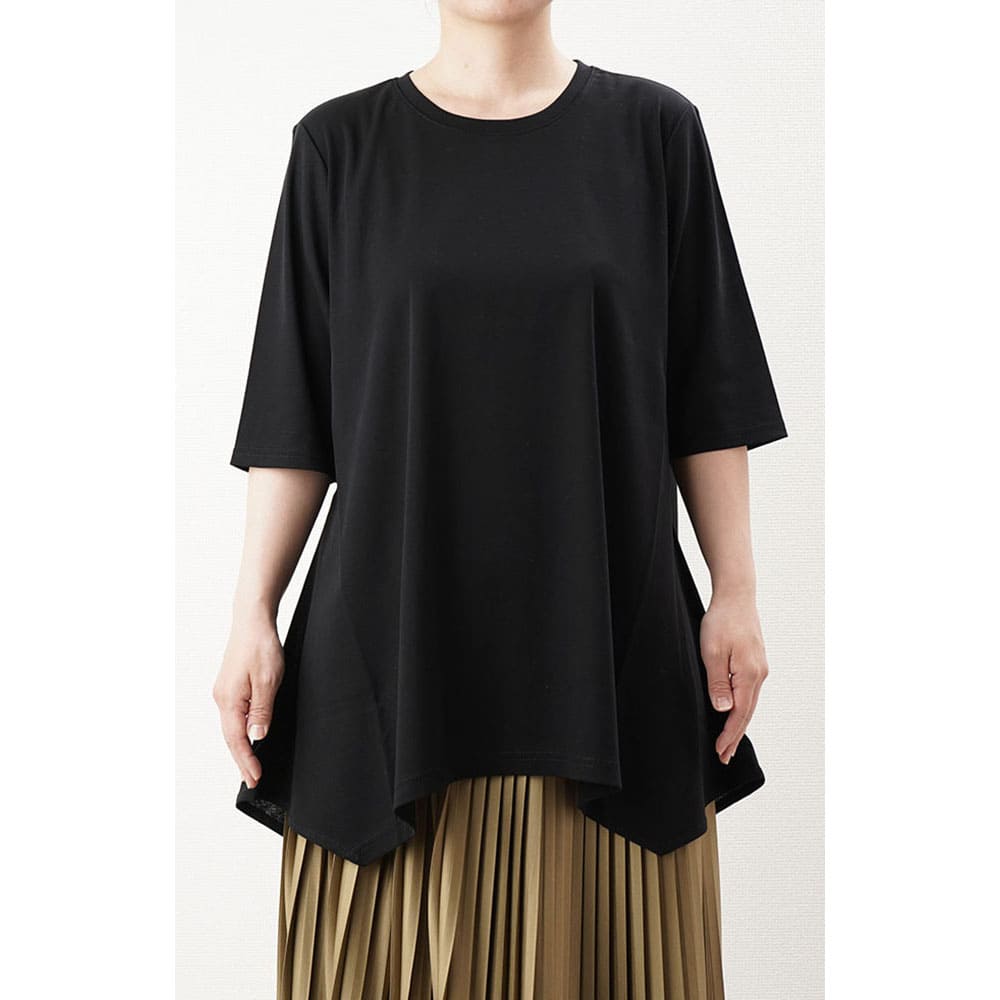 フレアに拡がる裾デザインがお洒落なチュニックTシャツ Tシャツ感覚で気軽に着れて上手に体型をカバーできる大人の夏の普段着にピッタリです2上品で涼しい生地を使用