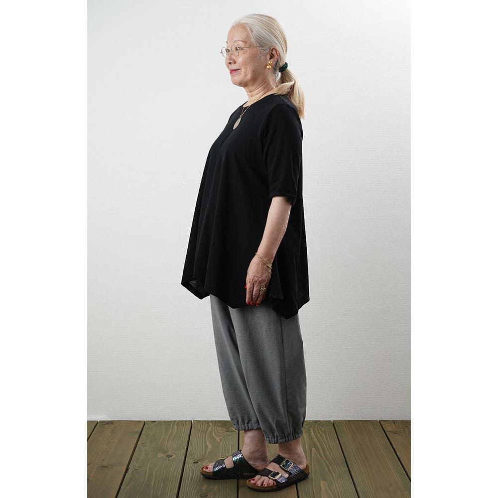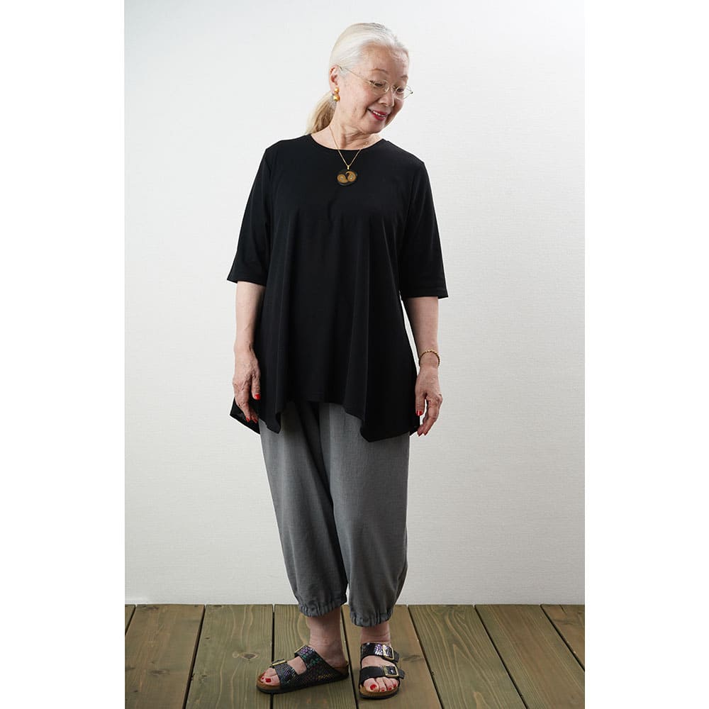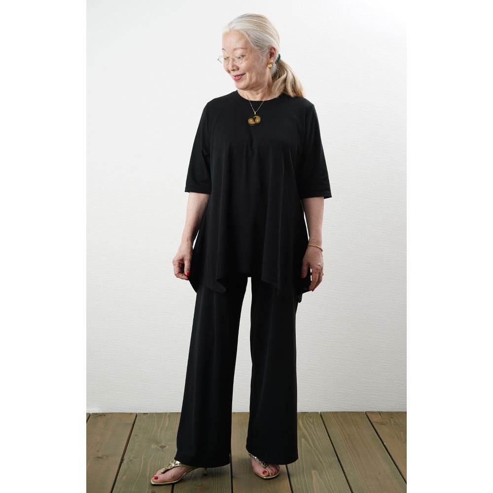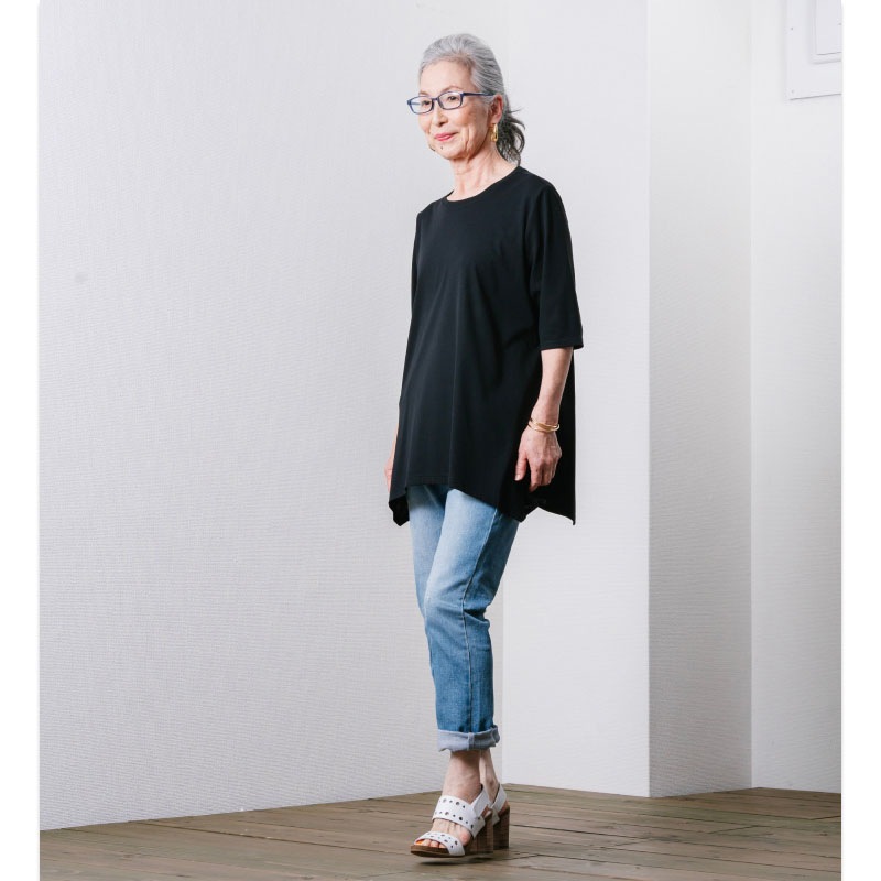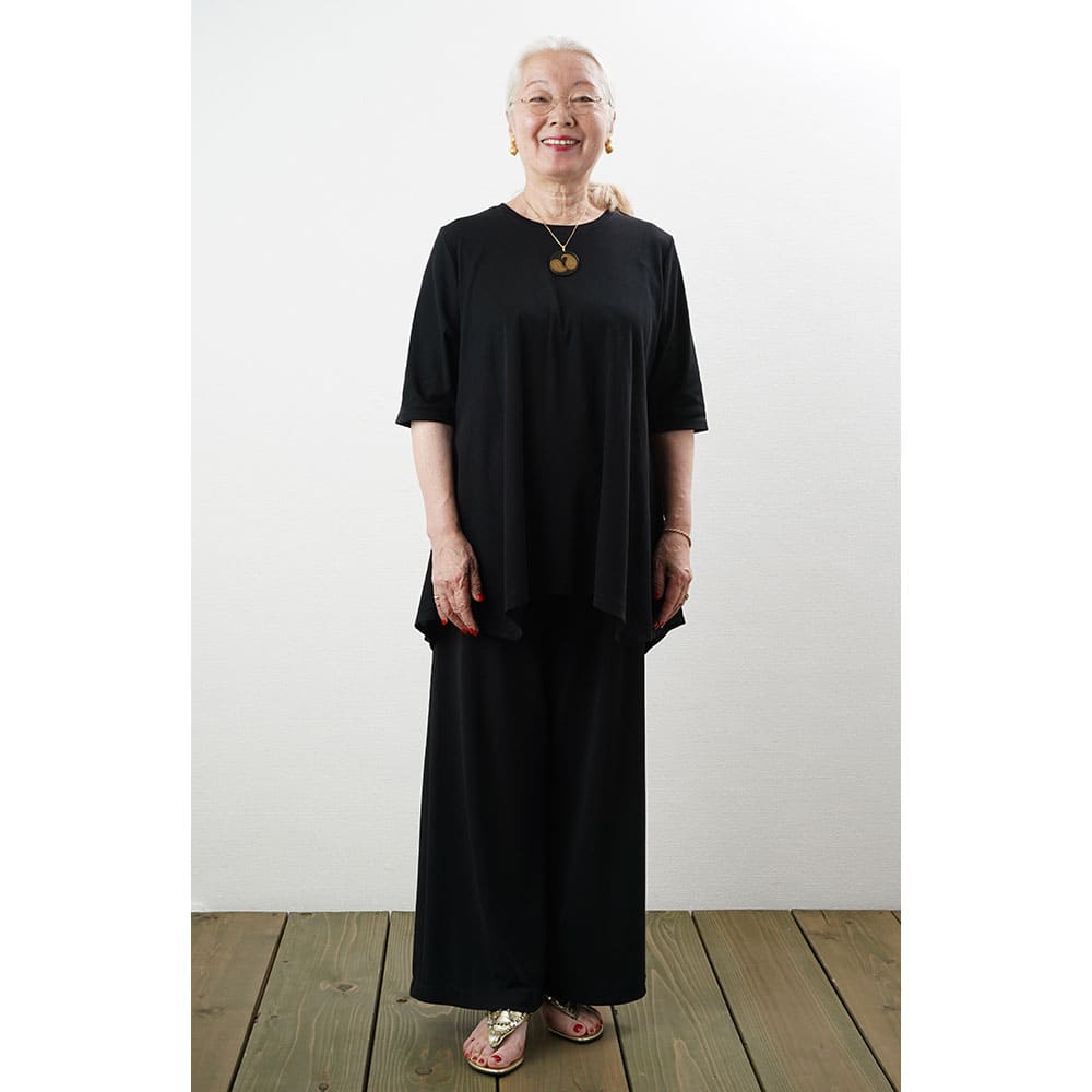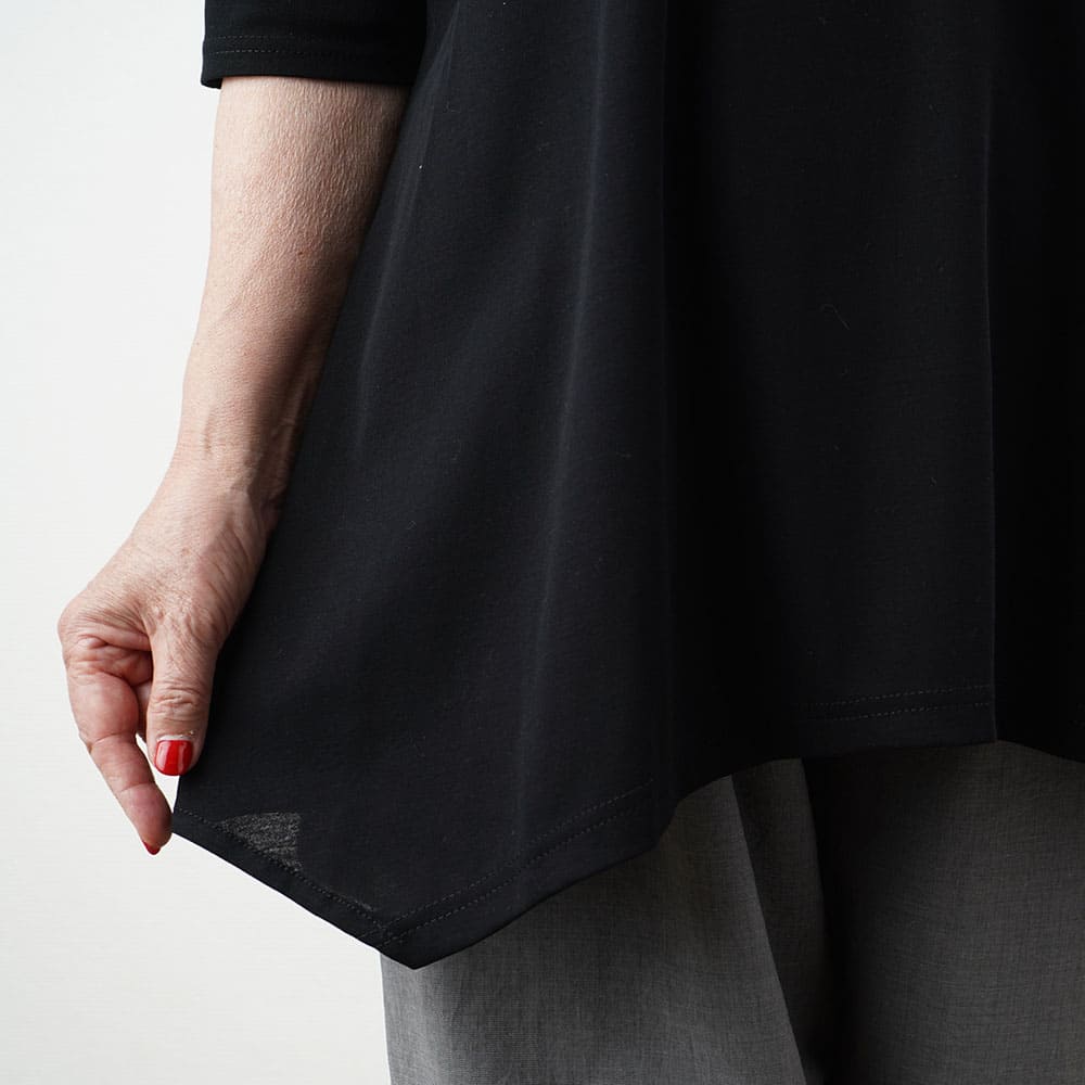 フレアに拡がる裾デザインがお洒落なチュニックTシャツ Tシャツ感覚で気軽に着れて上手に体型をカバーできる大人の夏の普段着にピッタリです2上品で涼しい生地を使用