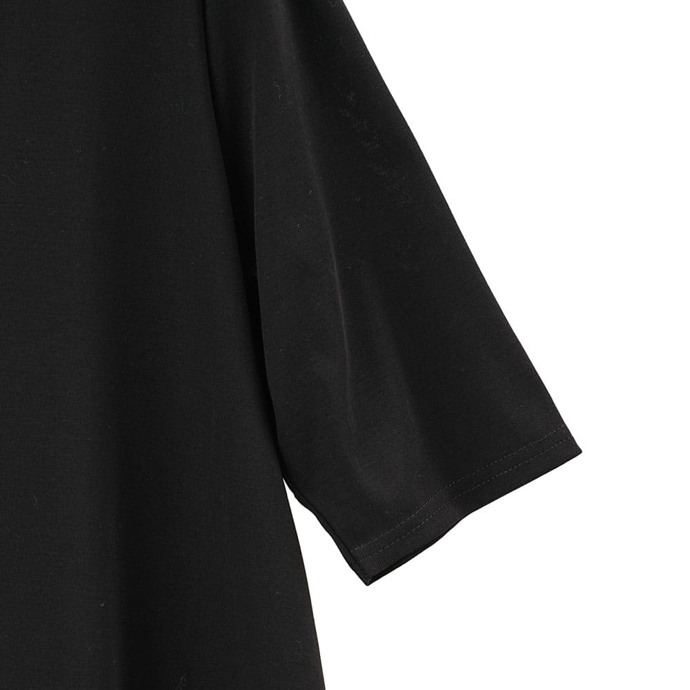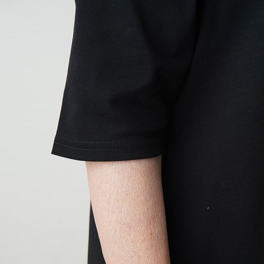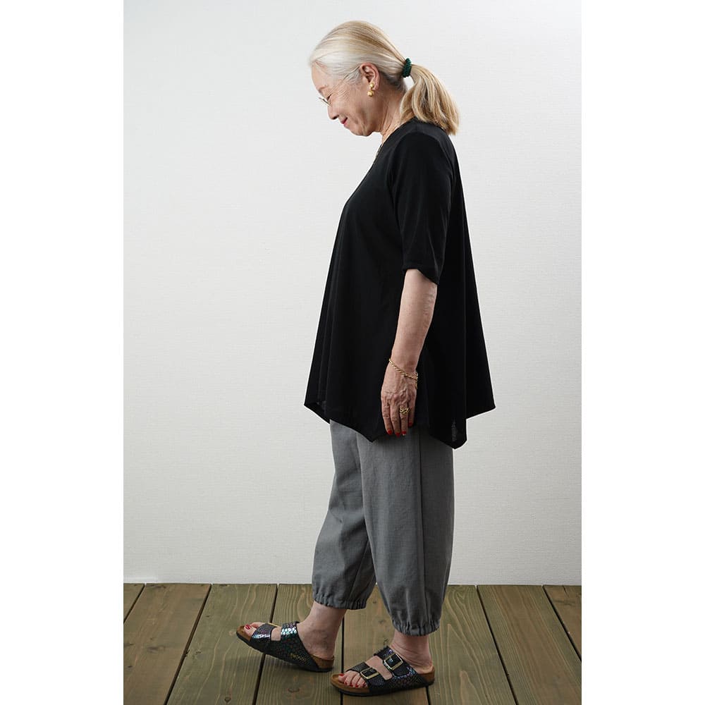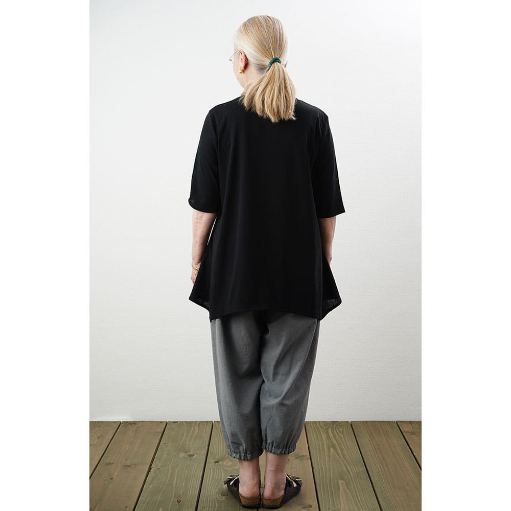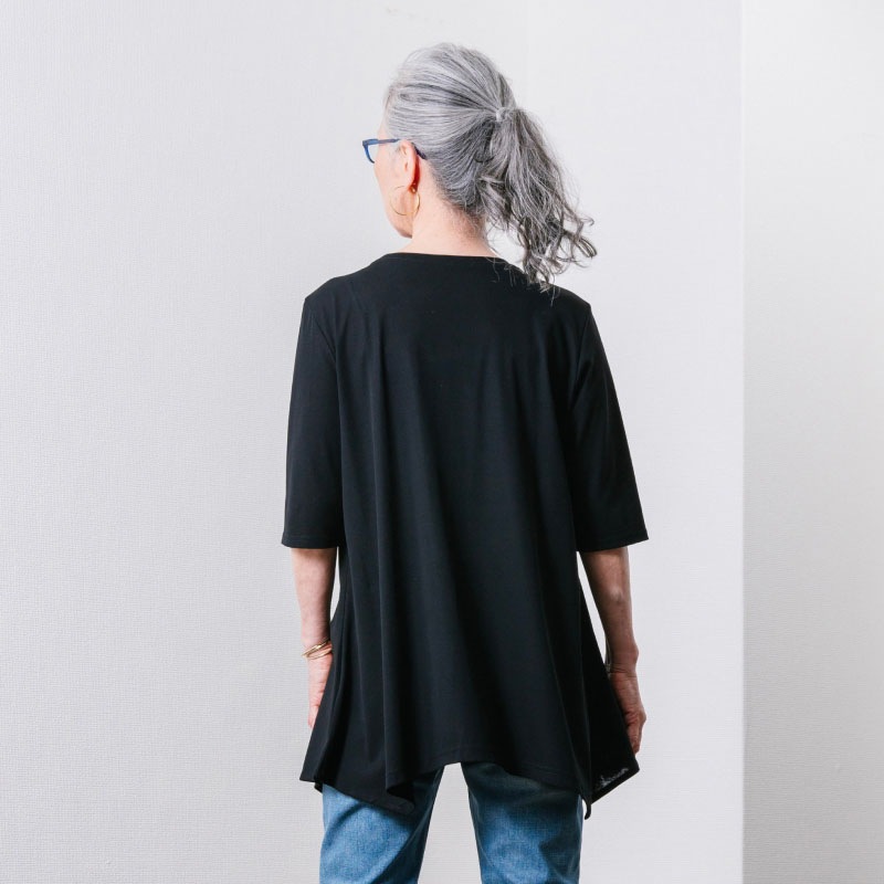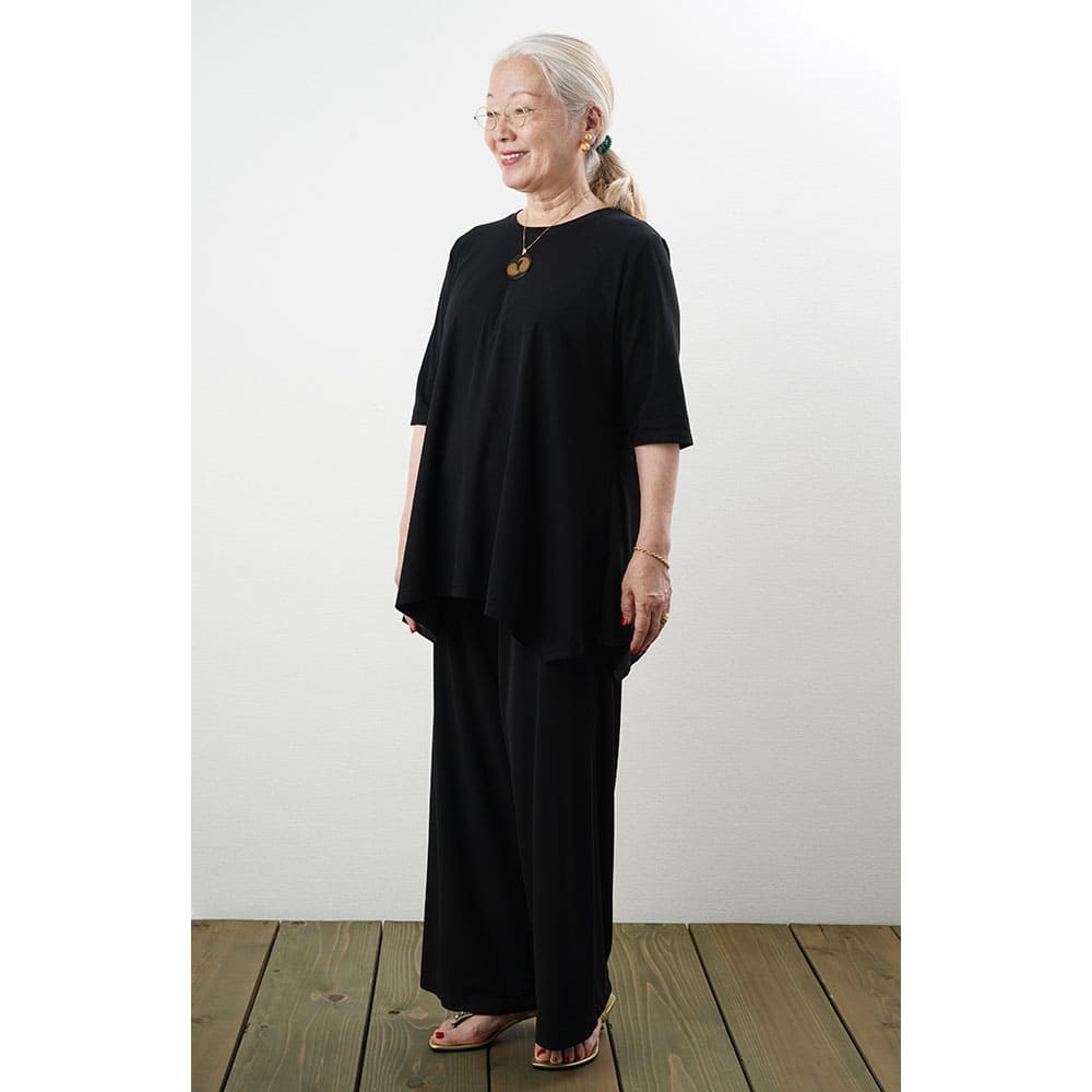 フレアに拡がる裾デザインがお洒落なチュニックTシャツ Tシャツ感覚で気軽に着れて上手に体型をカバーできる大人の夏の普段着にピッタリです2上品で涼しい生地を使用