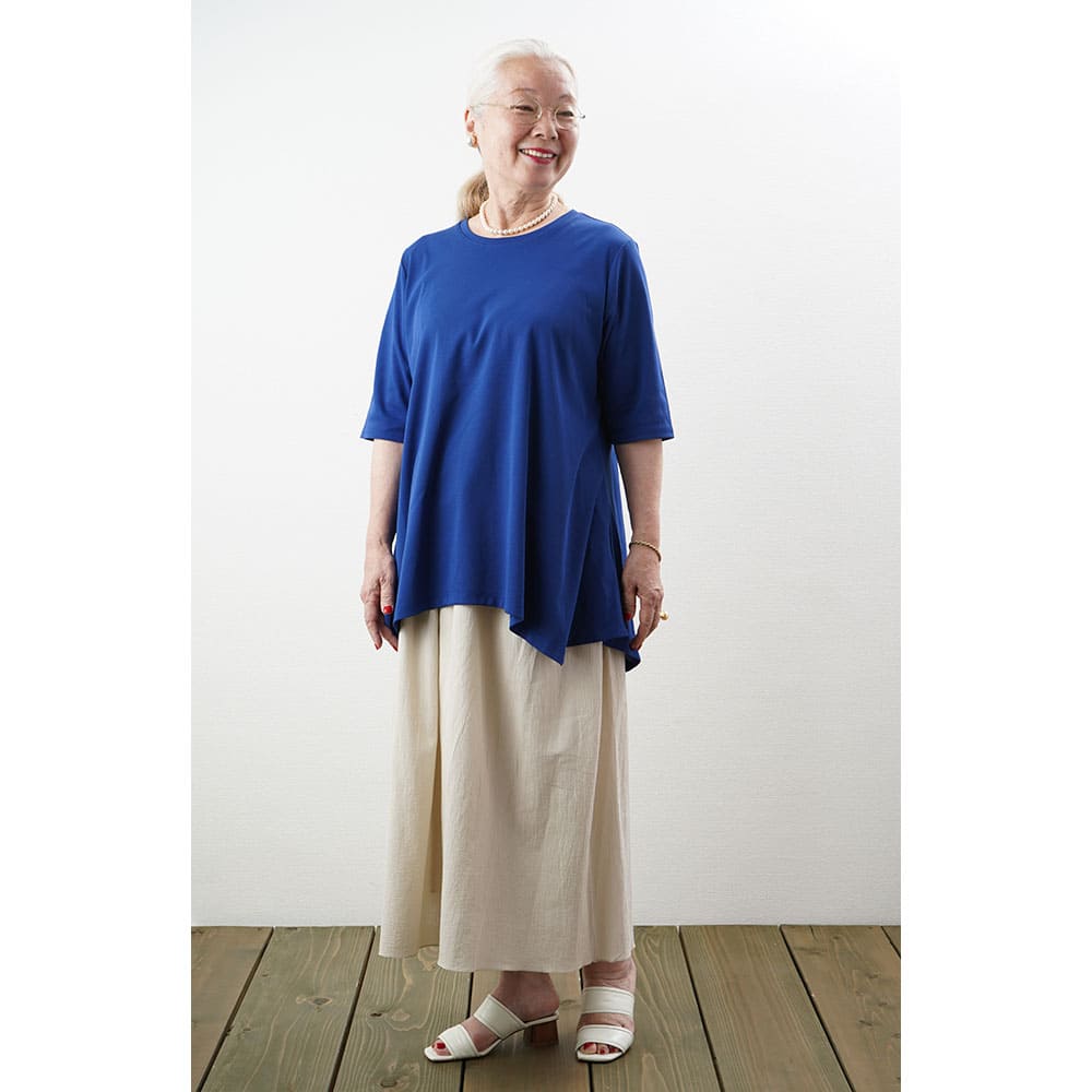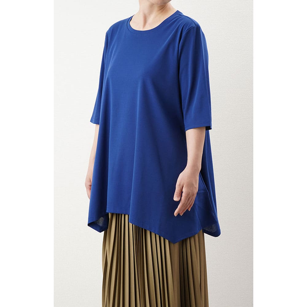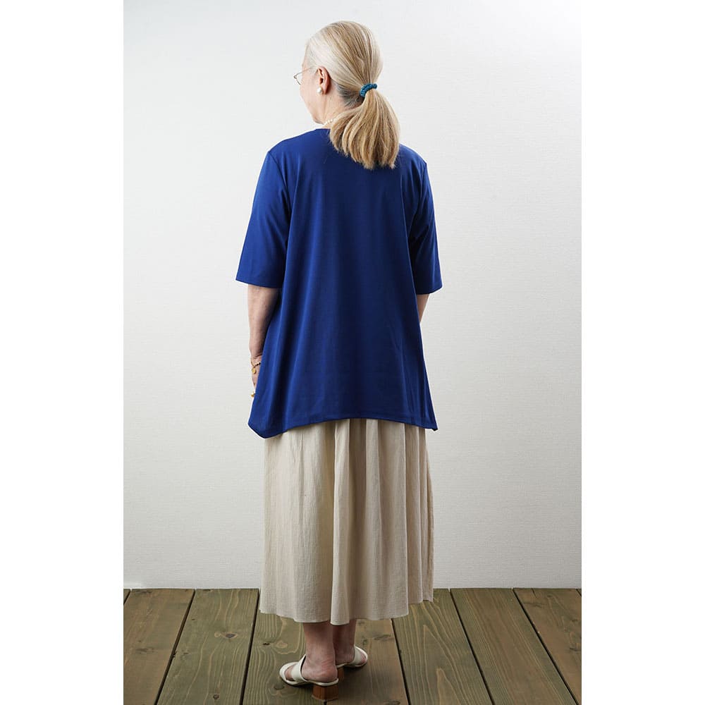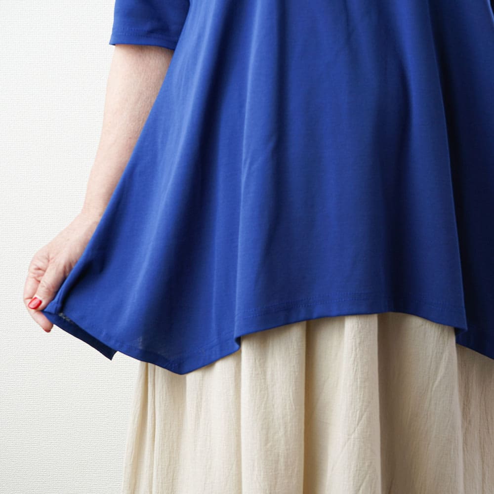 フレアに拡がる裾裾デザインがお洒落なチュニックTシャツ Tシャツ感覚で気軽に着れて上手に体型をカバーできる大人の夏の普段着にピッタリです2上品で涼しい生地を使用
