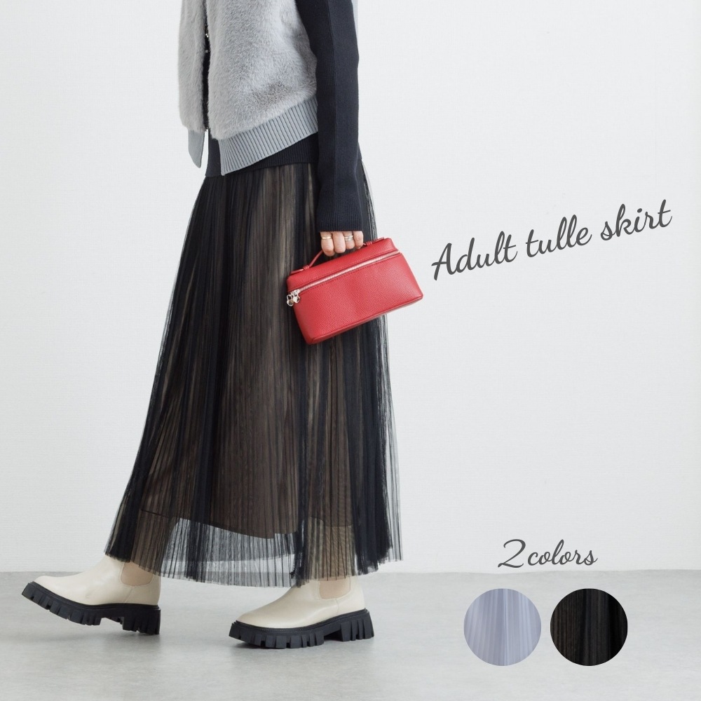 すとんと落ち感のあるなめらかなチュール素材は、広がりすぎず下半身をすっきりと見せてくれます。