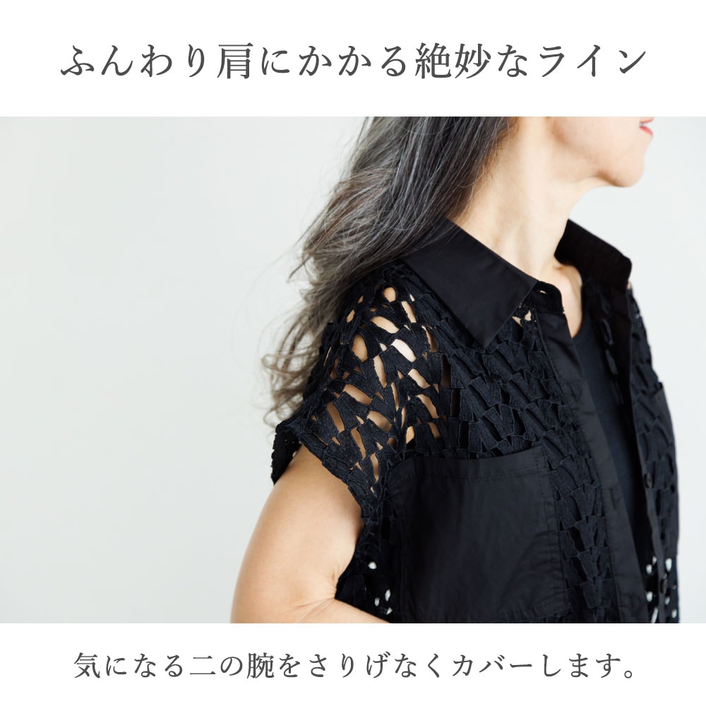 軽やかで風通しのよい素材は、暑い季節の重ね着にもぴったり。 ノースリーブに合わせれば、ふんわり肩にかかる絶妙なラインが、気になる二の腕をさりげなくカバーしてくれます。