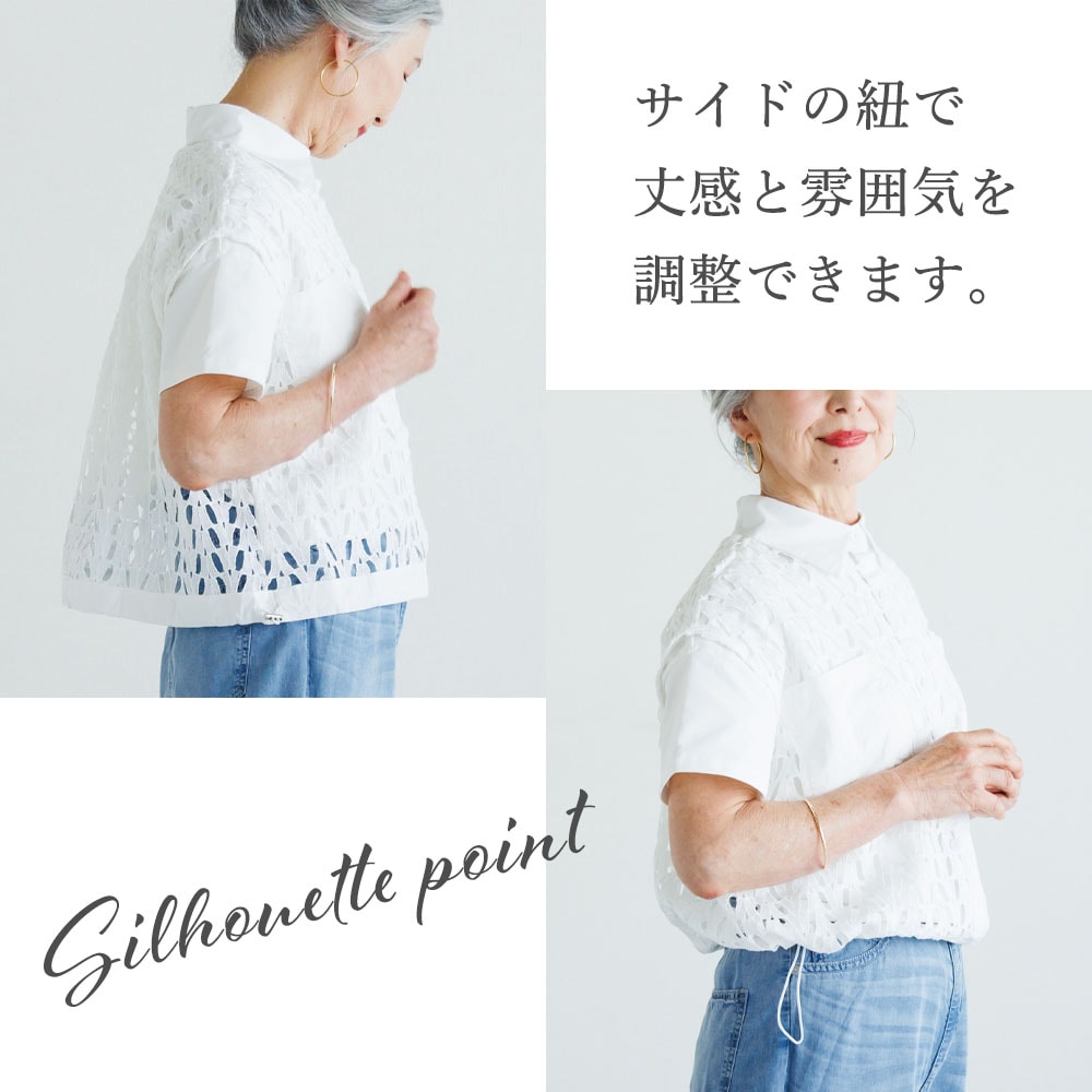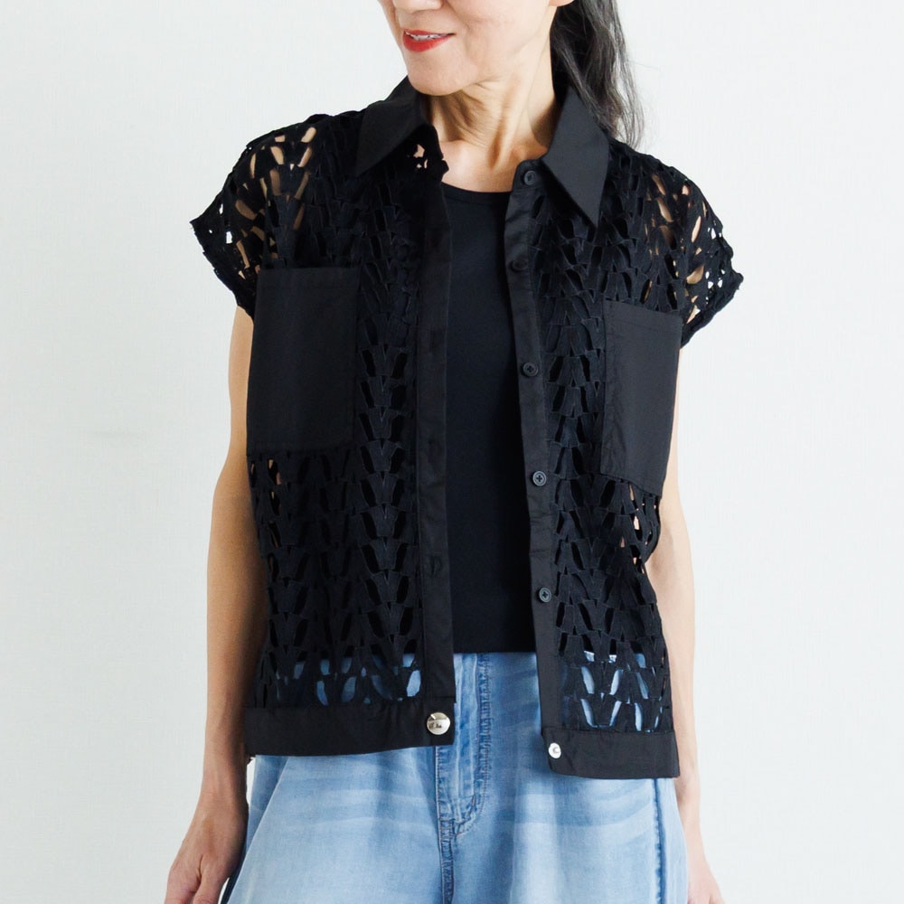 レース素材を使った、襟付きのショートベスト。 一枚重ねるだけで、いつものTシャツやワンピースが、ぐっと“今っぽく”生まれ変わります。