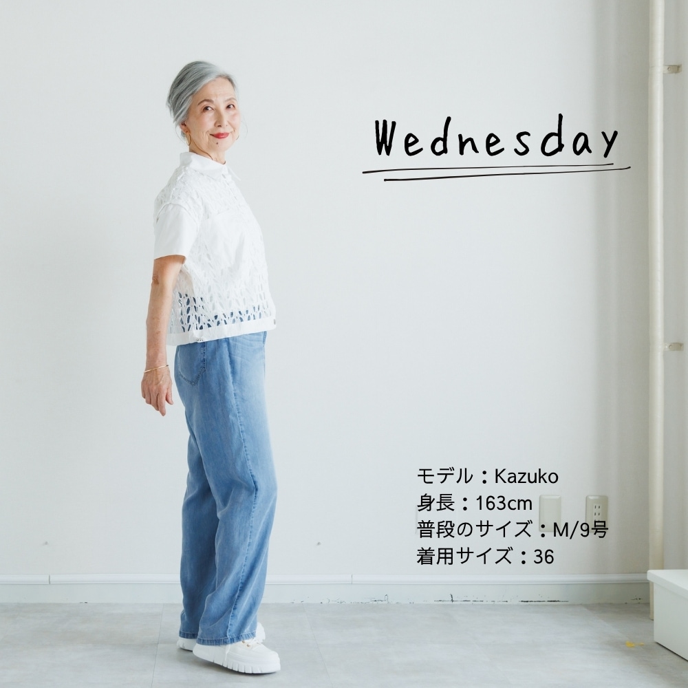 カラーは、やさしい印象の薄ブルーにさりげない色落ち加工をプラス。暑い季節はさらりと1枚で、肌寒い季節はニットやカーデと合わせて。通気性と軽さを備えた素材だから、春から秋まで長く愛用できて合わせるトップスを選びません。 そして何より、履いた瞬間の“気持ちよさ”にきっと驚くはずです。