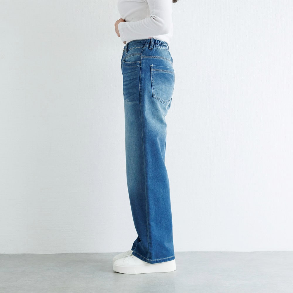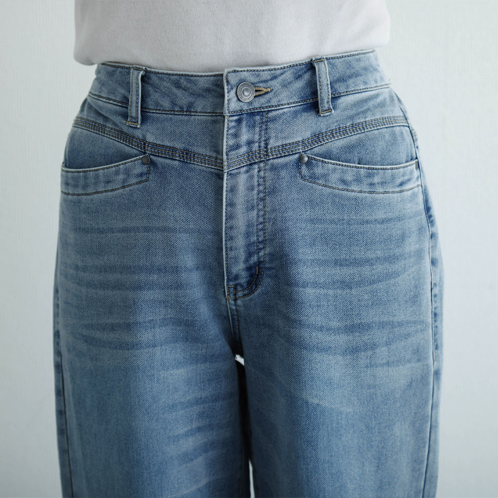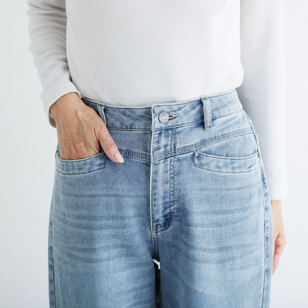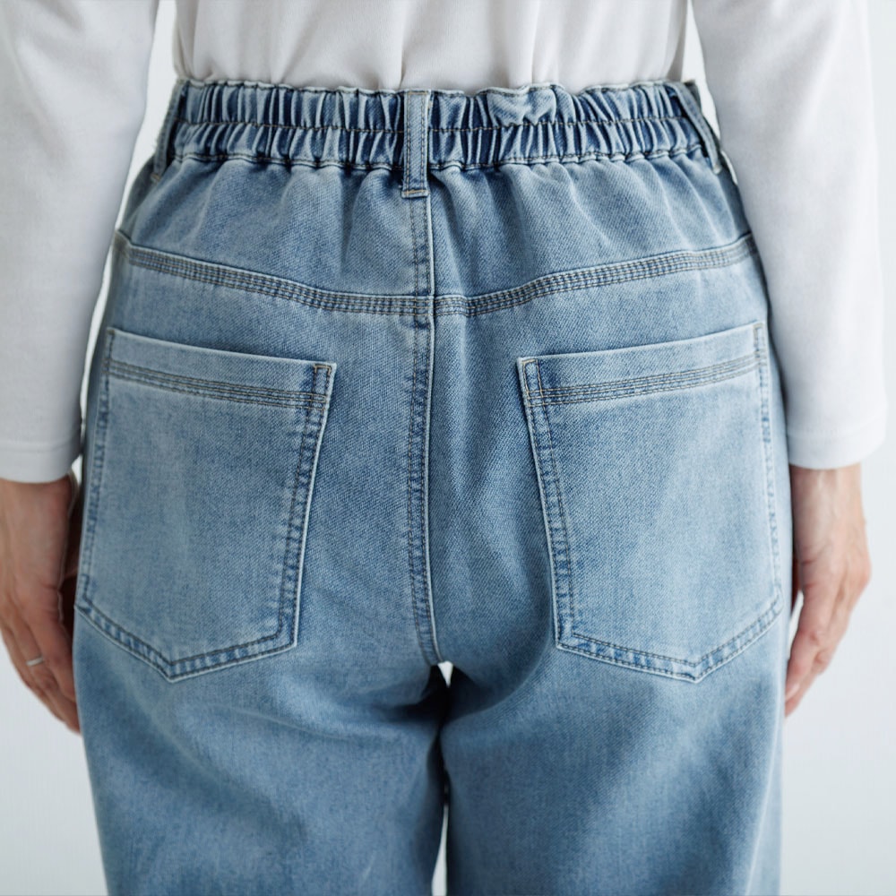このデニムは、体型の変化も気にせず快適に履けるように開発されました。デニム本来の風合いはそのままに、程よい伸縮性があるためしゃがんだり座ったりしても窮屈さを感じません。