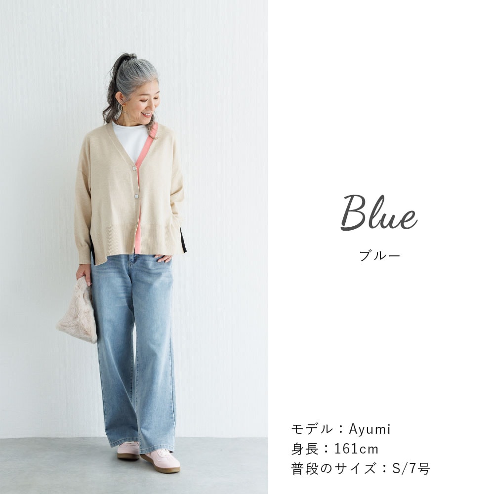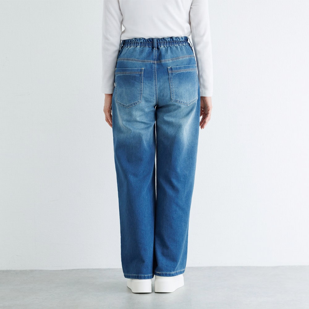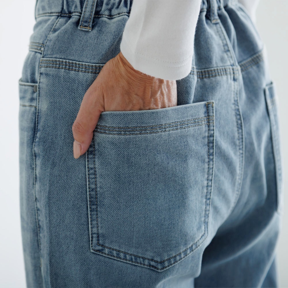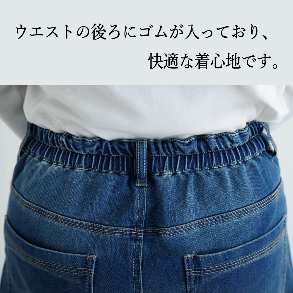 このデニムは、体型の変化も気にせず快適に履けるように開発されました。デニム本来の風合いはそのままに、程よい伸縮性があるためしゃがんだり座ったりしても窮屈さを感じません。