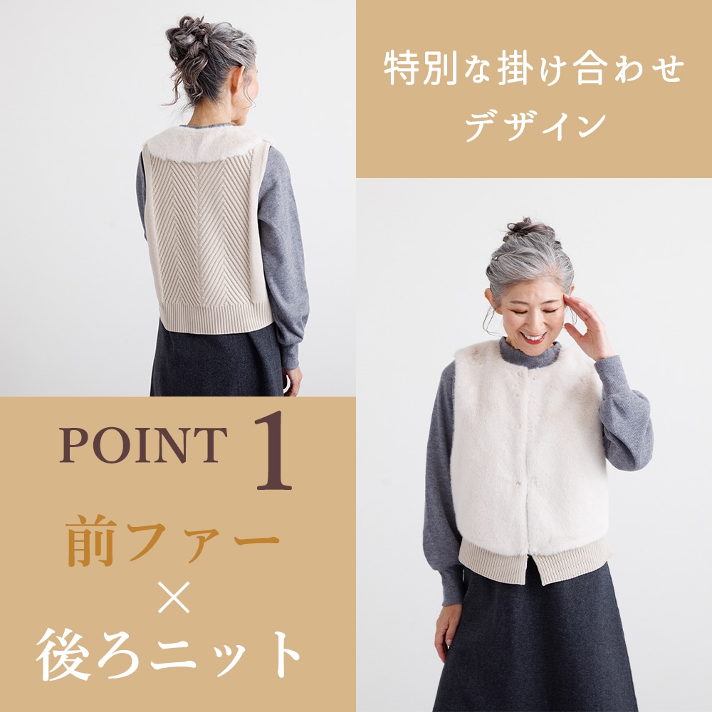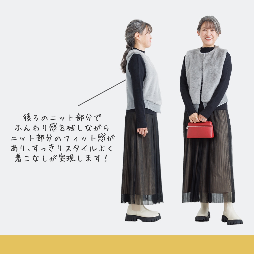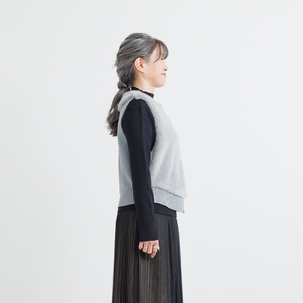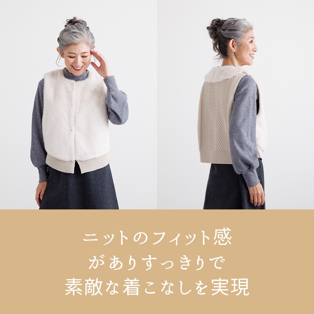 このベストの最大の特長は、表情豊かなファーと上品なニットを組み合わせた異素材MIXのデザイン性にあります。前身頃はリッチなファーの優雅なボリューム感、そして後ろ身頃には肌触りの良いニット素材を採用しました。これにより、ファーベスト特有の着ぶくれ感を解消し、後ろ姿は縦のラインが強調されてすっきりと見えます。