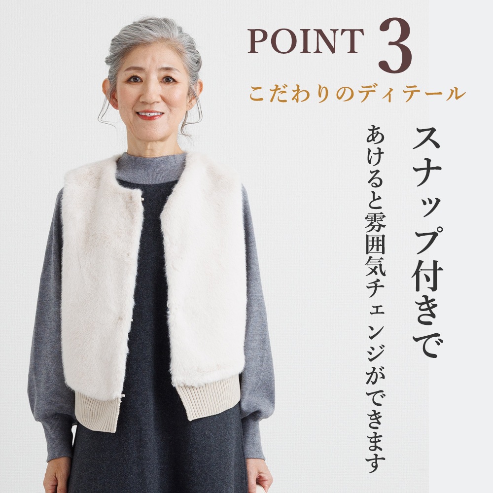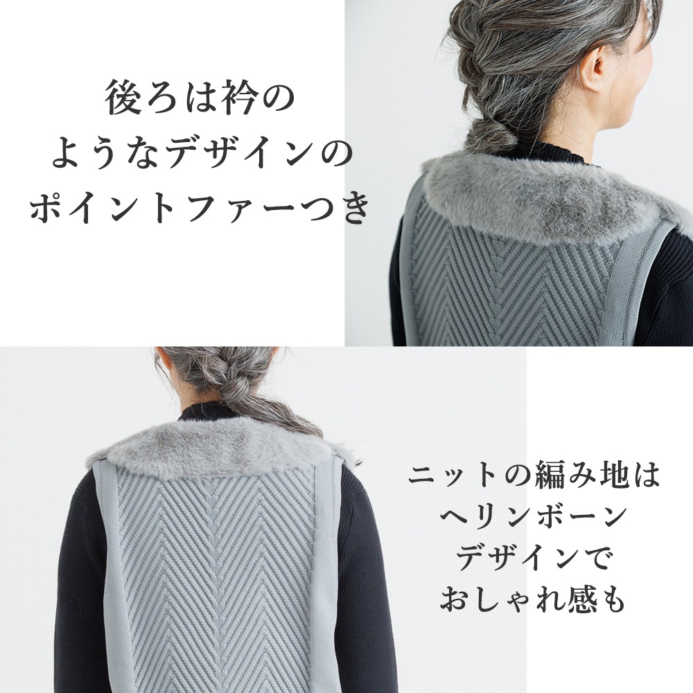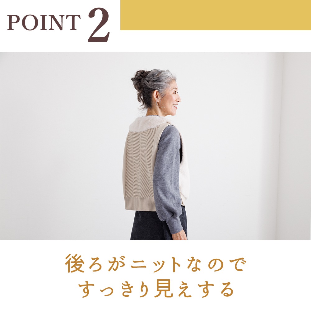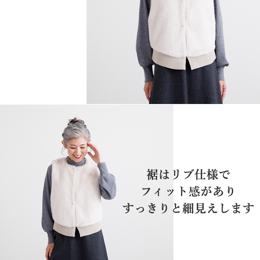 このベストの最大の特長は、表情豊かなファーと上品なニットを組み合わせた異素材MIXのデザイン性にあります。前身頃はリッチなファーの優雅なボリューム感、そして後ろ身頃には肌触りの良いニット素材を採用しました。これにより、ファーベスト特有の着ぶくれ感を解消し、後ろ姿は縦のラインが強調されてすっきりと見えます。