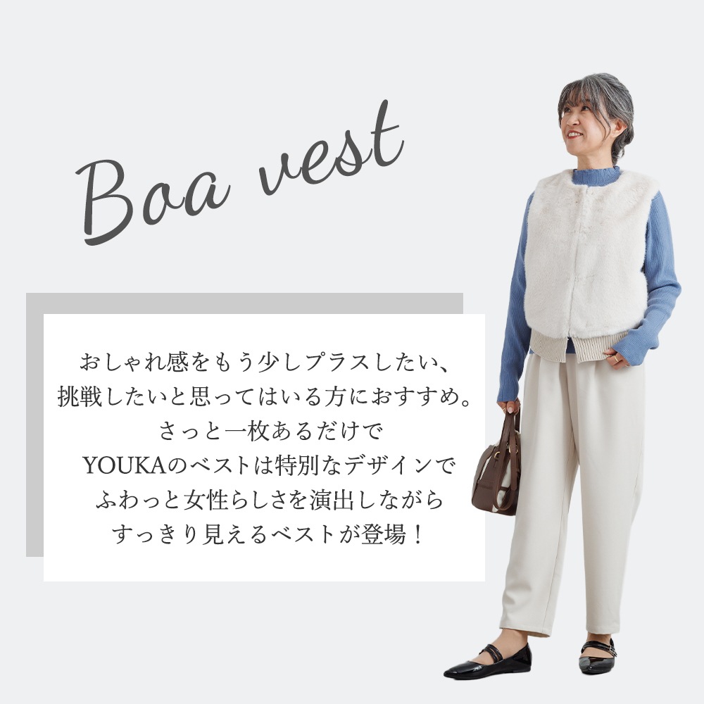 他にはあまり見られないこのデザインは、まさに**「特別なベスト」**として、シンプルになりがちな秋冬のコーディネートをぐっと格上げします。前はフック仕様になっており、閉めてきちんと感を出しても、開けてロングカーディガンのように軽やかに羽織っても素敵です。