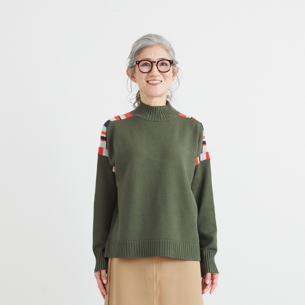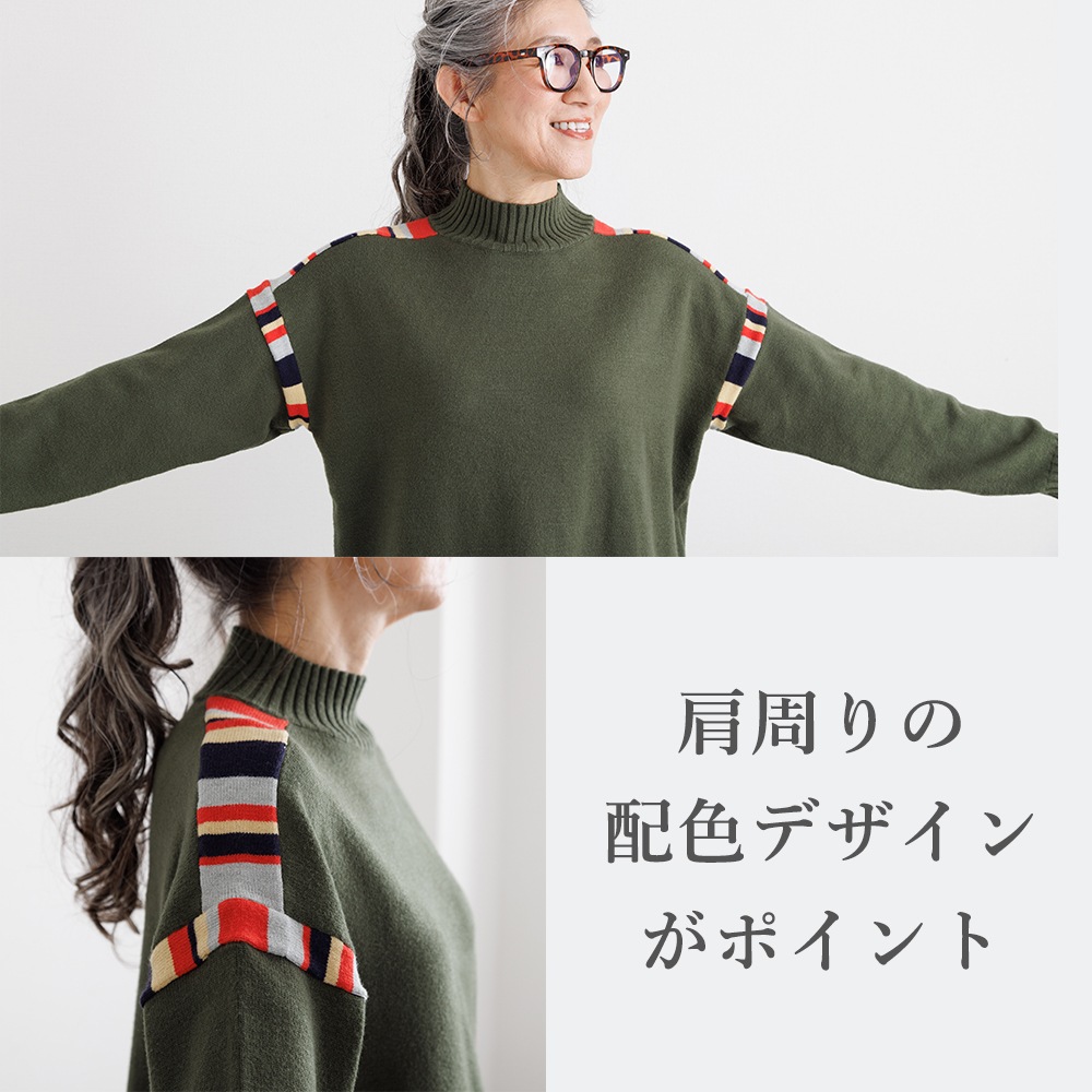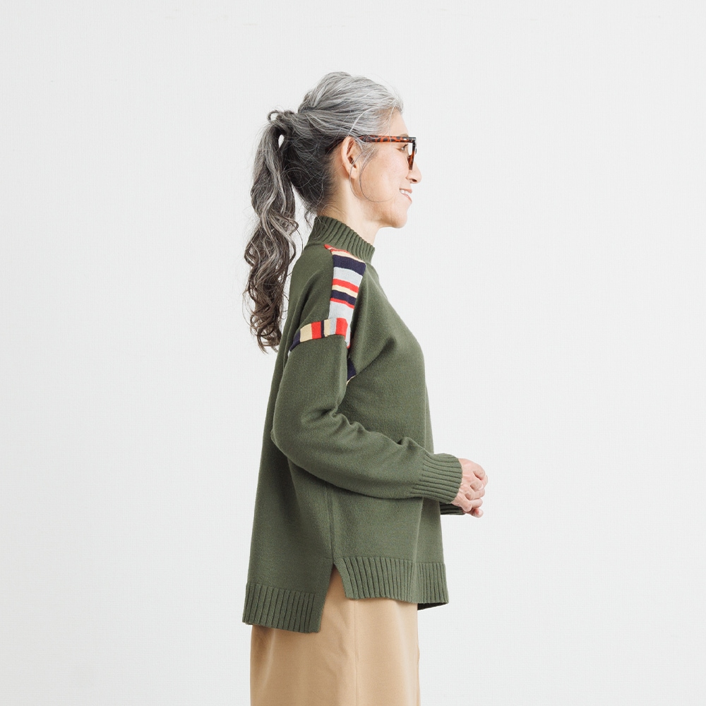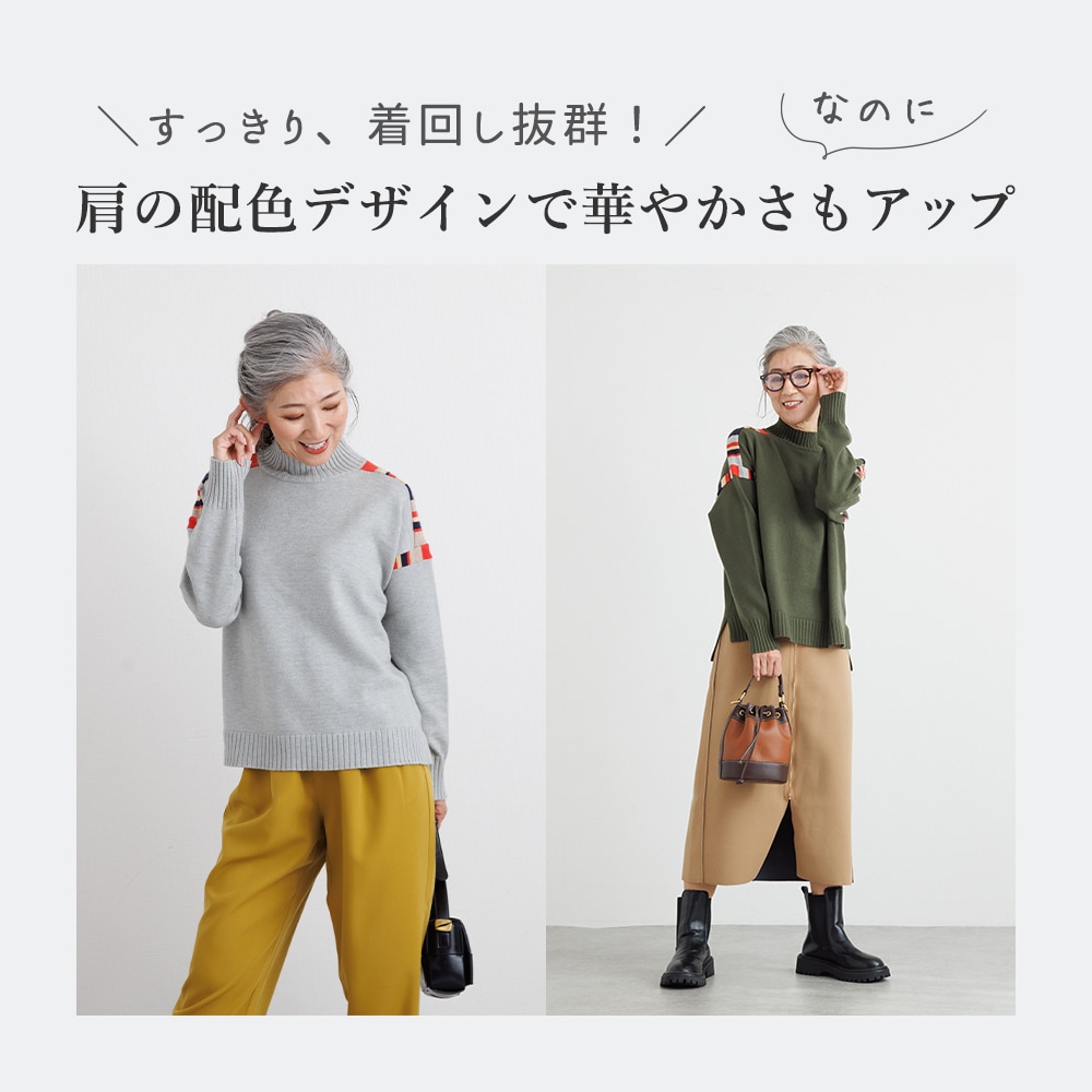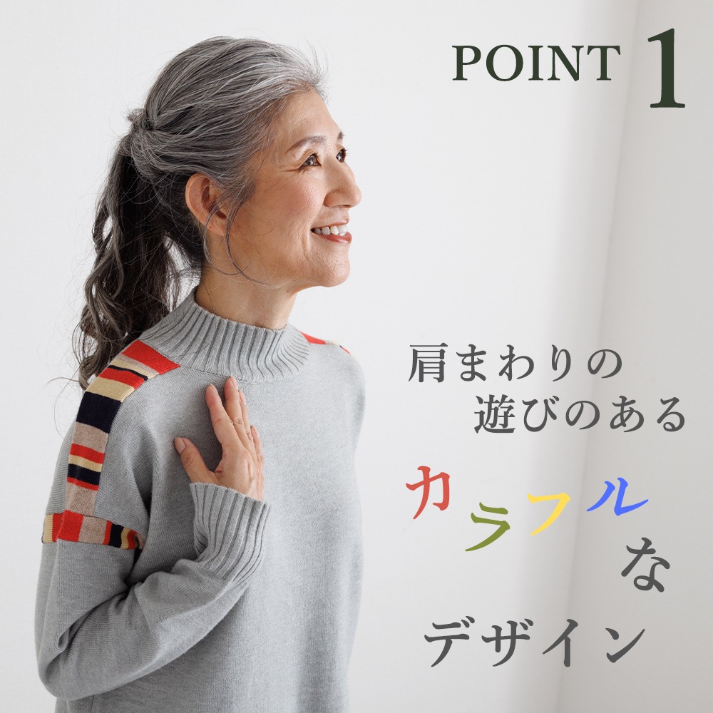 このニットの主役は、肩周りに施された、計算されたカラフルな配色デザインです。顔周りの印象をパッと明るくしながらも、ベースカラーとの調和を考え抜いた配色なので、大人の女性にふさわしい上品な遊び心を感じさせます。