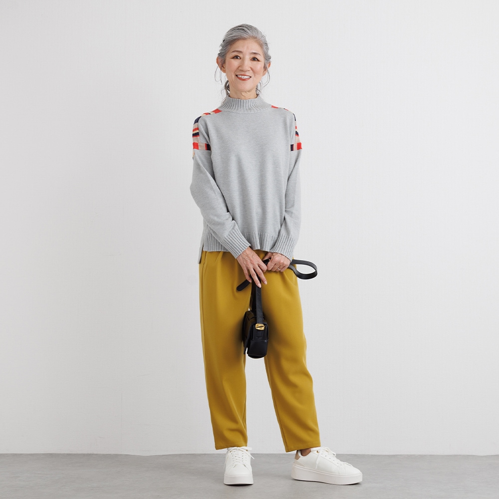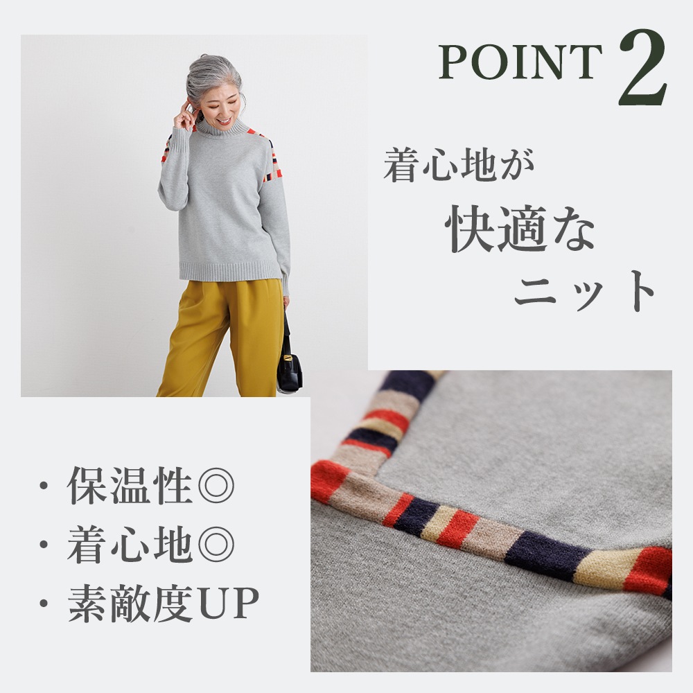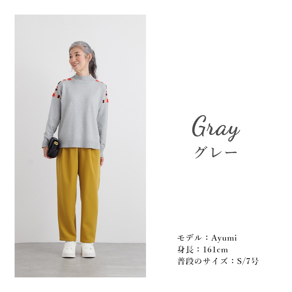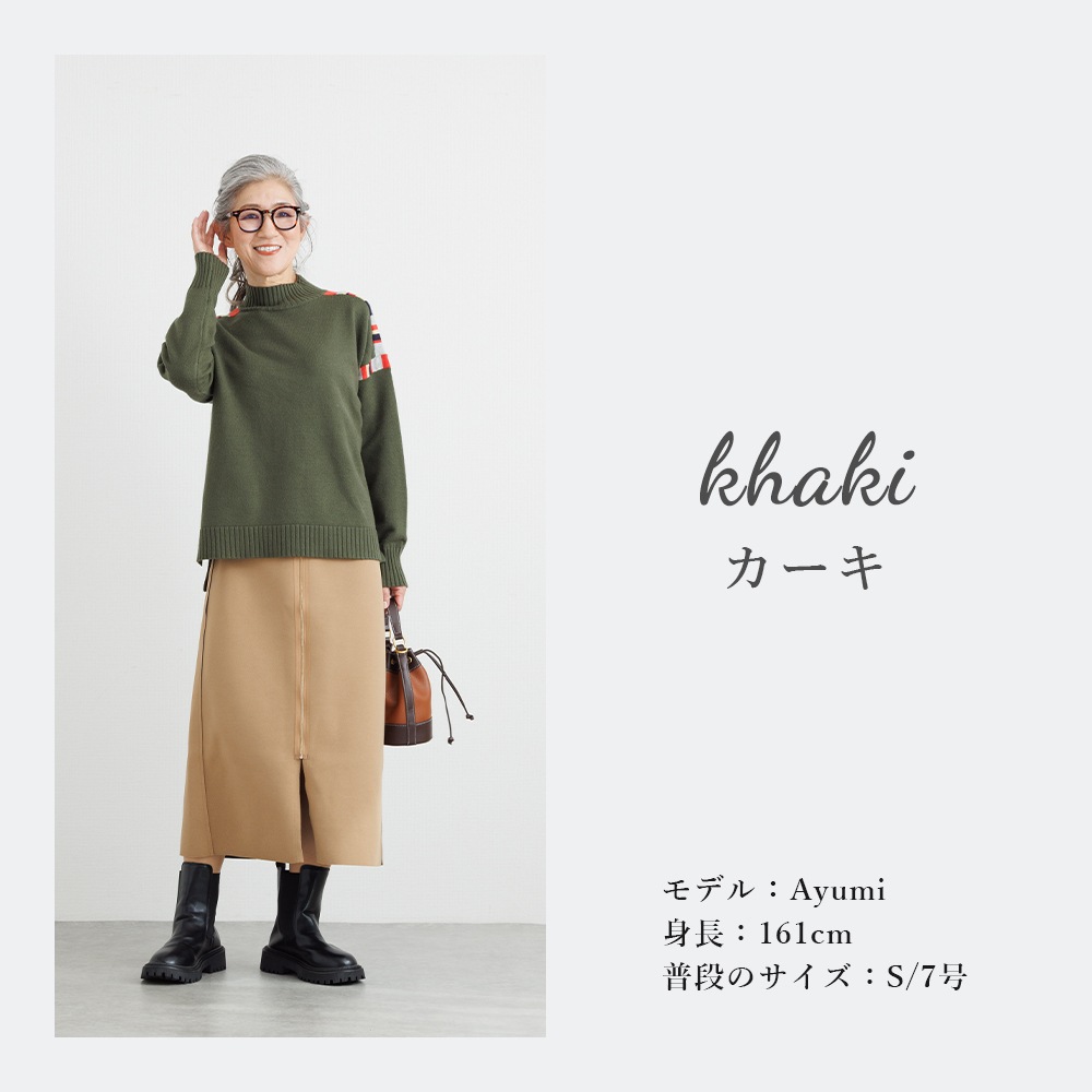このニットの主役は、肩周りに施された、計算されたカラフルな配色デザインです。顔周りの印象をパッと明るくしながらも、ベースカラーとの調和を考え抜いた配色なので、大人の女性にふさわしい上品な遊び心を感じさせます。