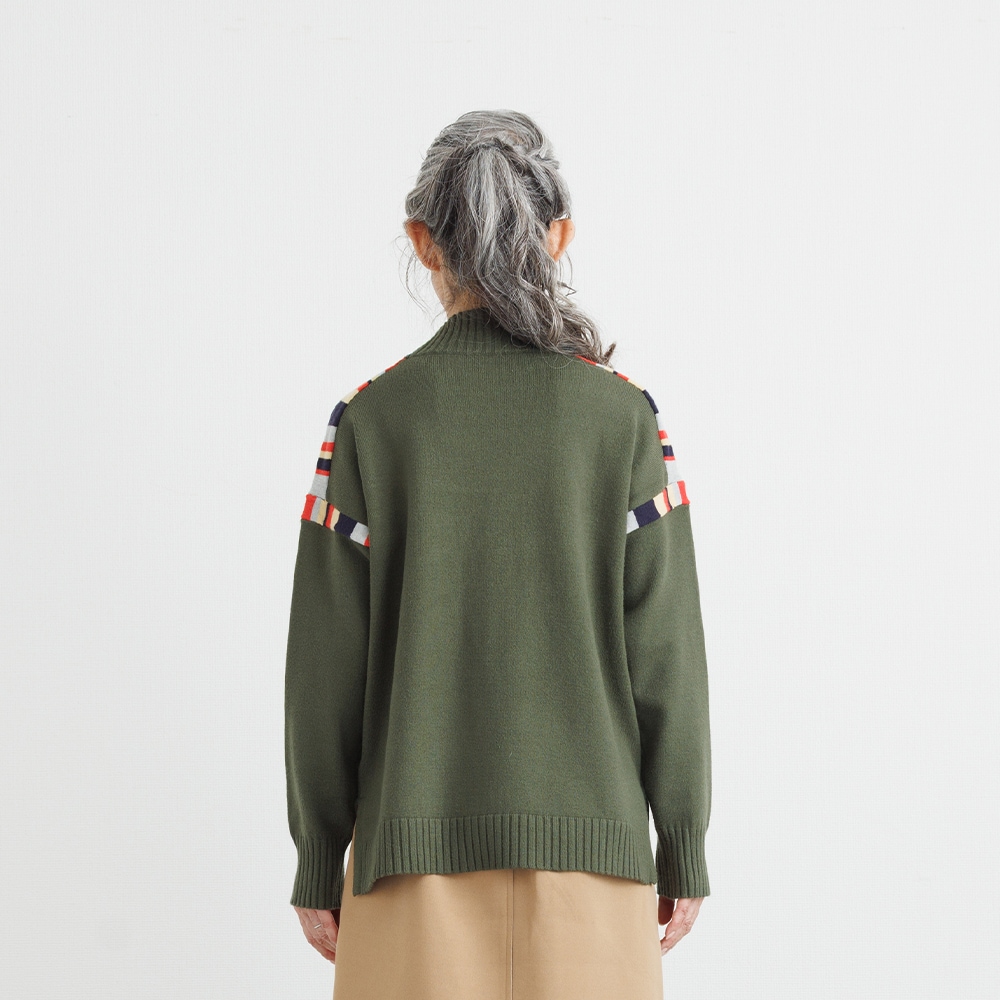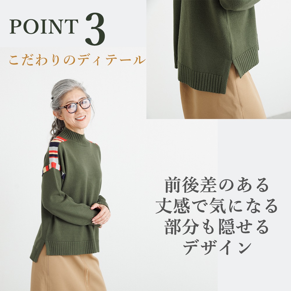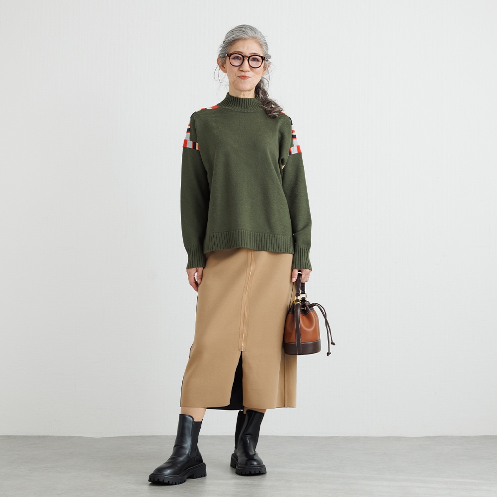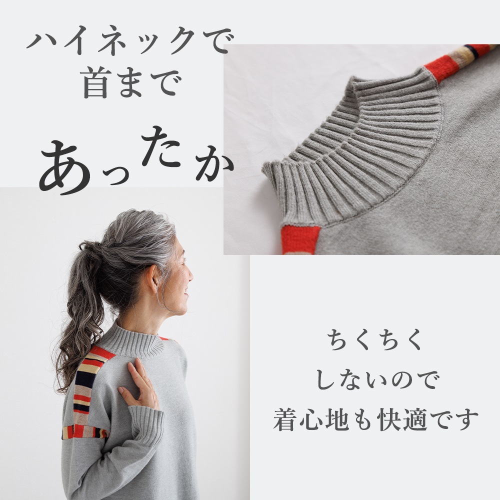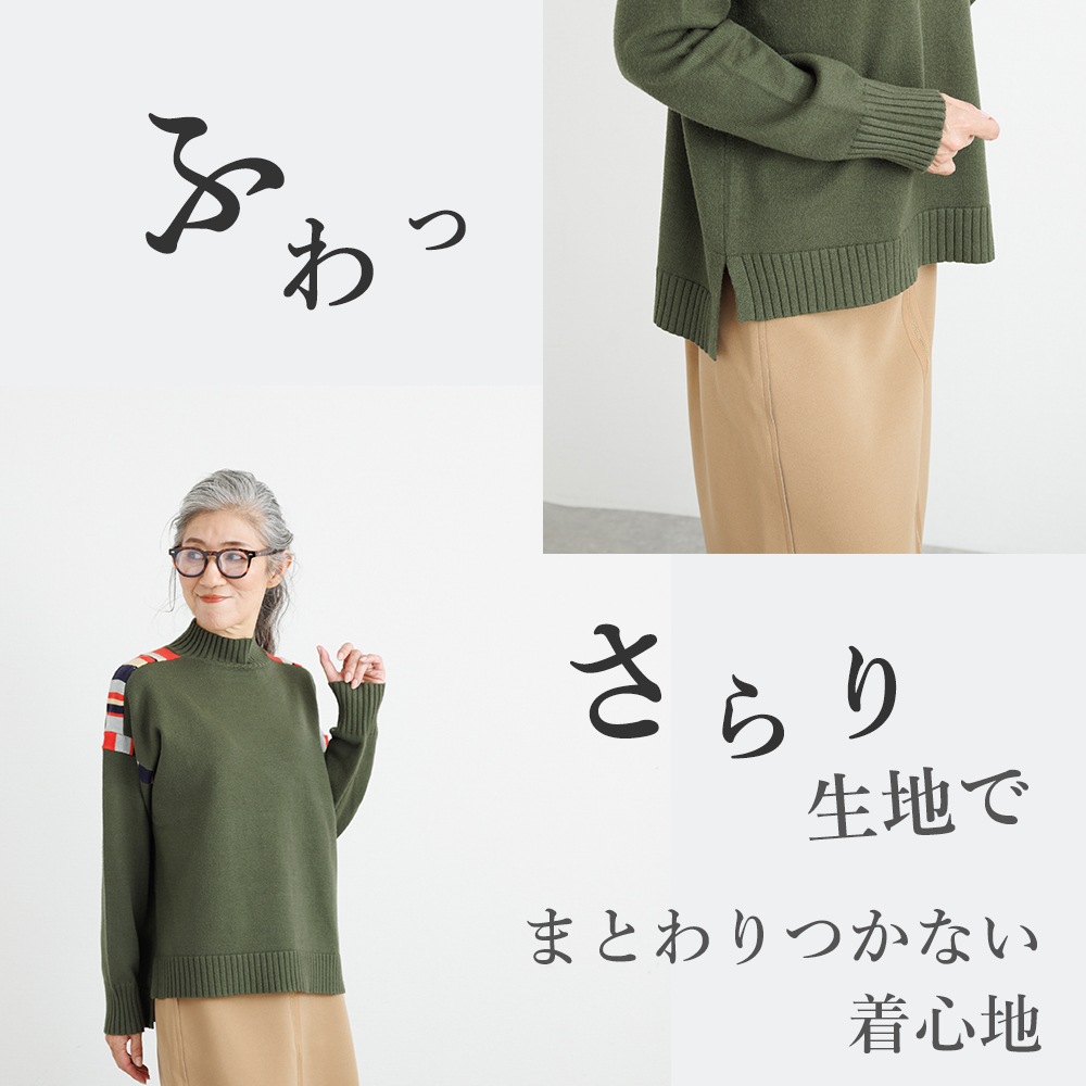 このニットの主役は、肩周りに施された、計算されたカラフルな配色デザインです。顔周りの印象をパッと明るくしながらも、ベースカラーとの調和を考え抜いた配色なので、大人の女性にふさわしい上品な遊び心を感じさせます。